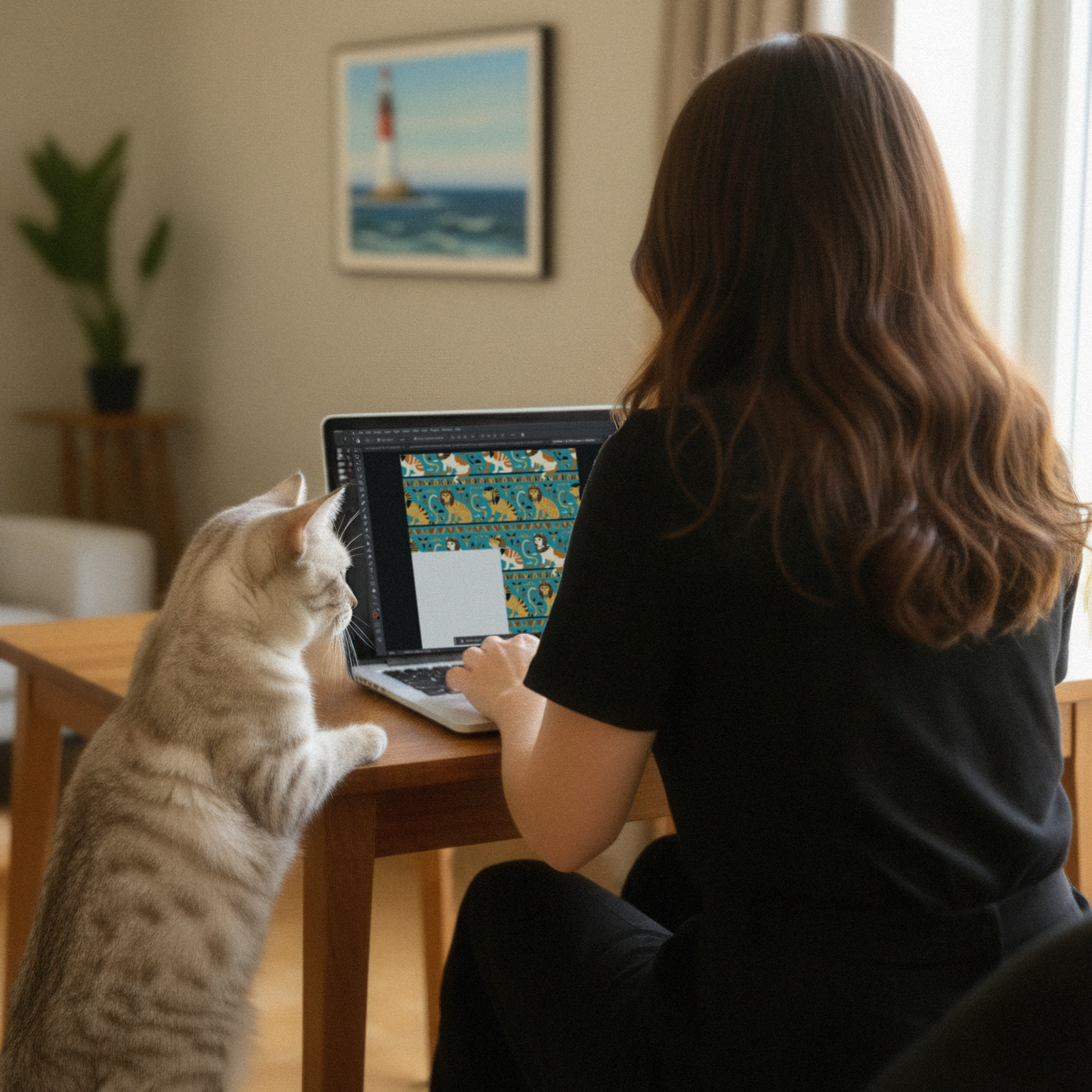 As a graphics designer, I've always been fascinated by patterns, there's something about the way they repeat and flow that just clicks with me. So I started creating my own patterns in my spare time, just for fun, and eventually began having them printed on house decor items like pillows and blankets. I'd design these unique cat themed prints, and Rajah would immediately test out whatever I made. If he curled up and started purring? The pattern was a winner. If he gave it one dismissive look and stalked off? Back to the drawing board. I'm not even kidding, there's a whole pile of items with Rajah rejected patterned pillow cases stuffed in my bedroom closet because apparently my design skills weren't up to his royal standards.